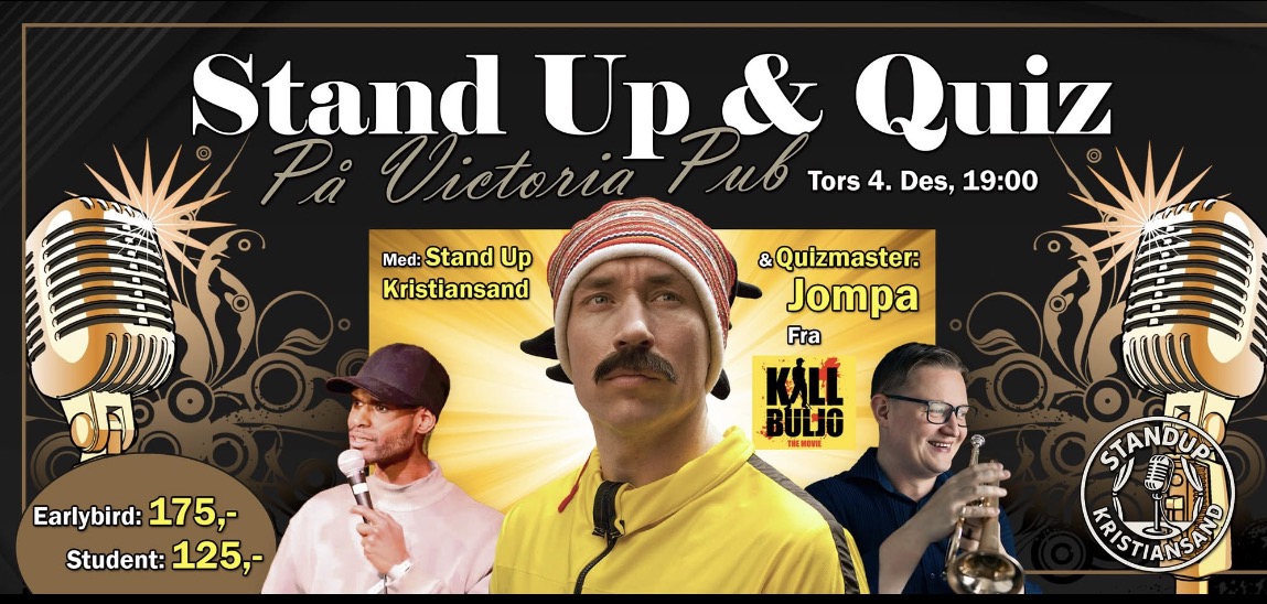 Stand Up Kristansand inviterer til en kveld du sent vil glemme - selveste Jompa fra kultfilmen Kill Buljo tar turen til Victoria Pub som kveldens Quizmaster. Billetter Earlybird 175,-. Studenter 125,-